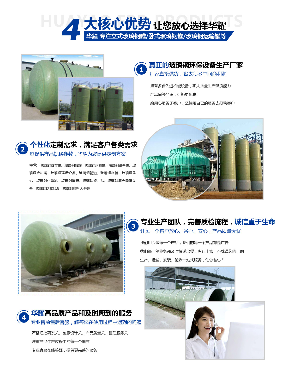 濰坊華耀玻璃鋼有限公司是生產(chǎn)玻璃鋼鹽酸罐,玻璃鋼儲(chǔ)存罐,立式玻璃鋼罐,臥式玻璃鋼罐的專業(yè)廠家,位于世界風(fēng)箏都濰坊安丘市收費(fèi)站北3公里206國道路西,位置優(yōu)越,交通便利,技術(shù)力量雄厚,檢測(cè)手段完善,產(chǎn)品質(zhì)量可靠,服務(wù)熱情周到,重合同,守信用。          玻璃鋼產(chǎn)品主要有:玻璃鋼儲(chǔ)罐、玻璃鋼儲(chǔ)存罐、玻璃鋼鹽酸罐、玻璃鋼容器、玻璃鋼儲(chǔ)槽,玻璃鋼運(yùn)輸罐,玻璃鋼冷卻塔,玻璃鋼環(huán)保設(shè)備,玻璃鋼管道,風(fēng)機(jī),水箱,玻璃鋼化糞池,化工設(shè)備,防腐設(shè)備襯里,玻璃鋼板瓦,玻璃鋼海產(chǎn)養(yǎng)殖設(shè)備,乙稀基樹脂,玻璃鋼纖維布等。       公司主要產(chǎn)品有: &....