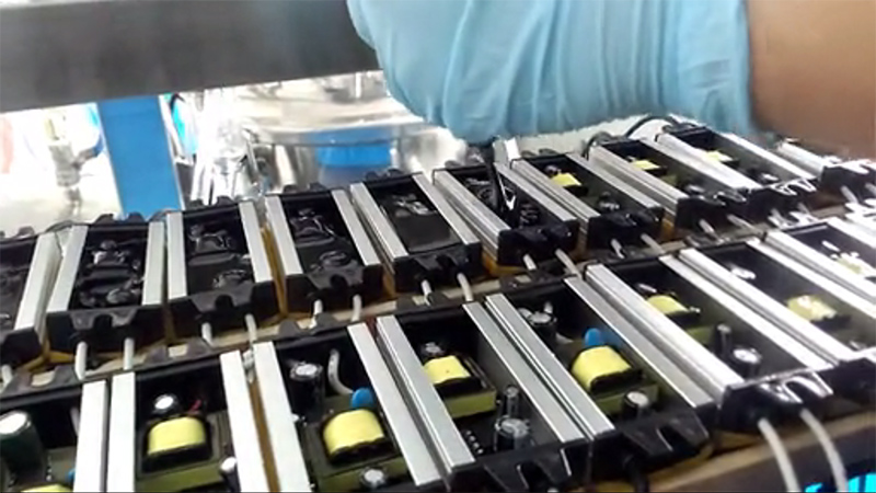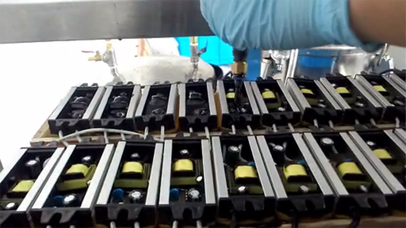 電子灌封膠有雙組份,也有單組份,本案例客戶深圳電子科技有限公司使用我司雙組份電子灌封膠進行電源灌模密封。采用機器進行真空環(huán)境下操作配比,將配比后的電子灌封膠經(jīng)過管道輸出就可以用于電源灌封使用。下面是客戶生產(chǎn)視頻拍攝由于手機拍攝像素問題導致不清晰,請諒解。